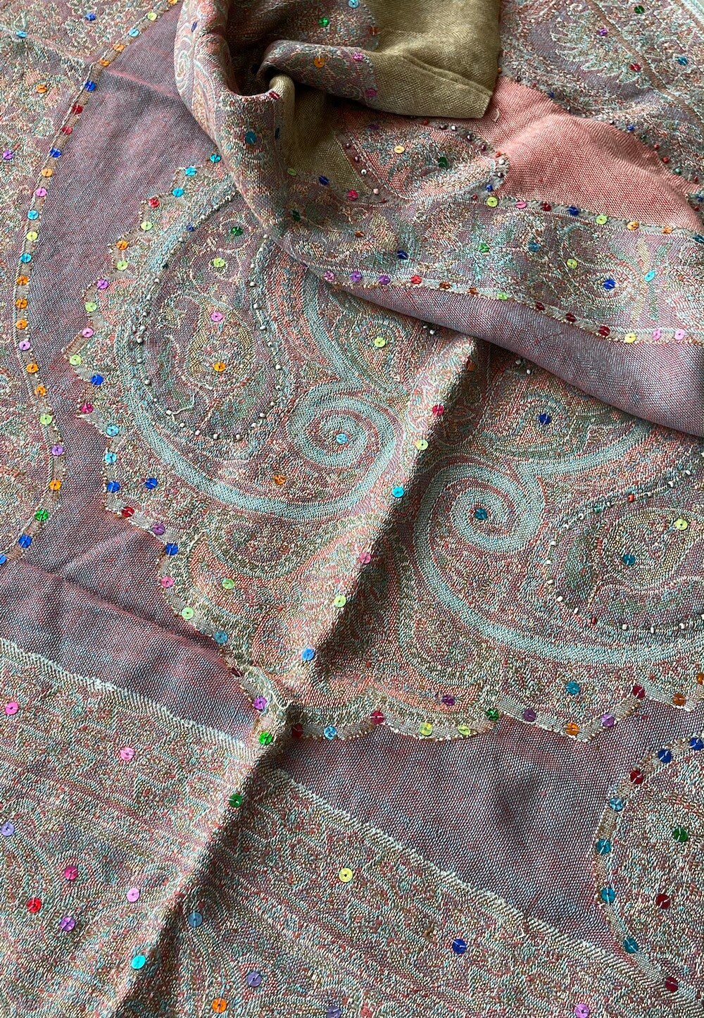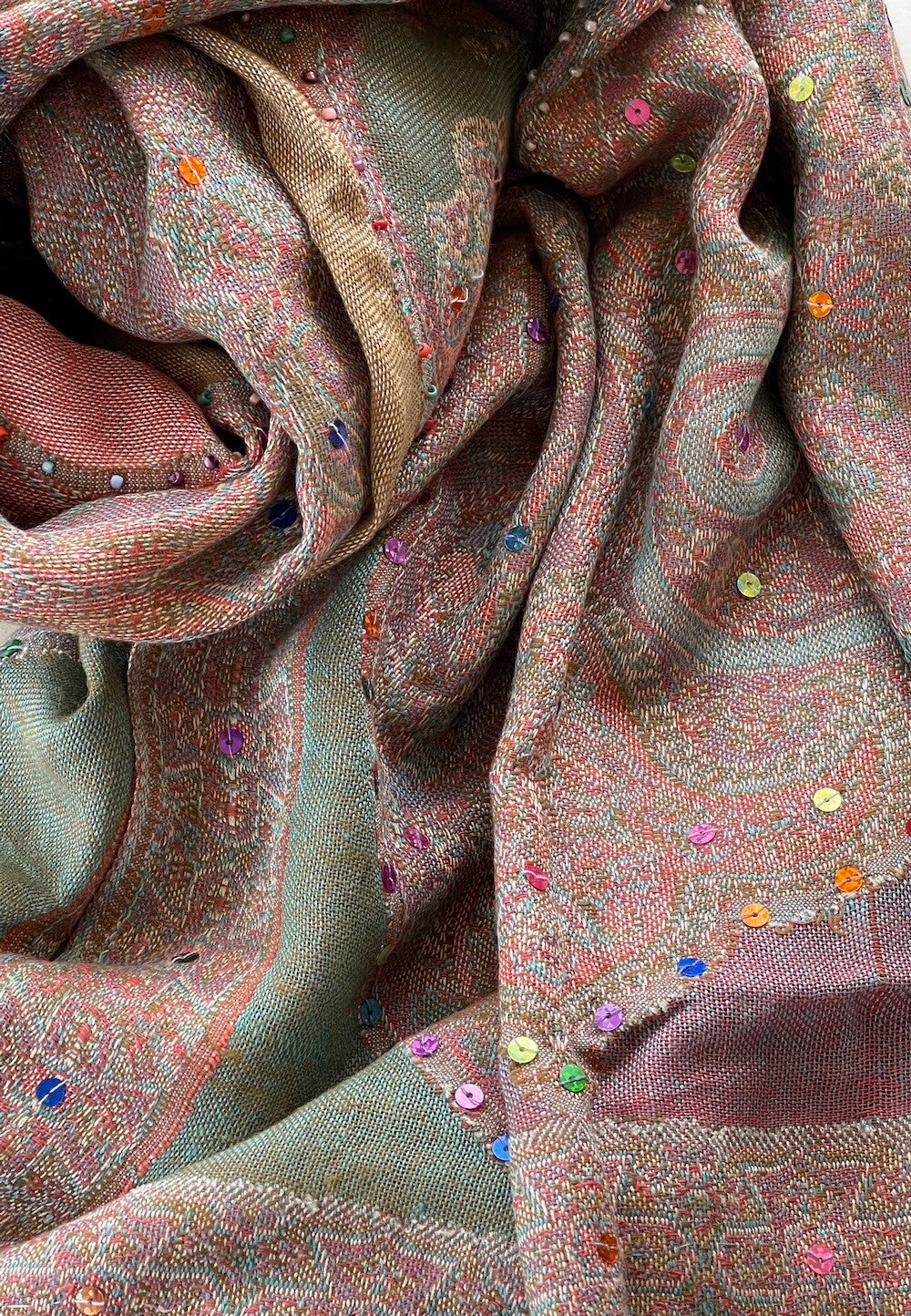 Zachte viscose sjaal in rood en turqoise, in paisleypatroon met opgenaaide accenten, uit India, mooie kwaliteit
