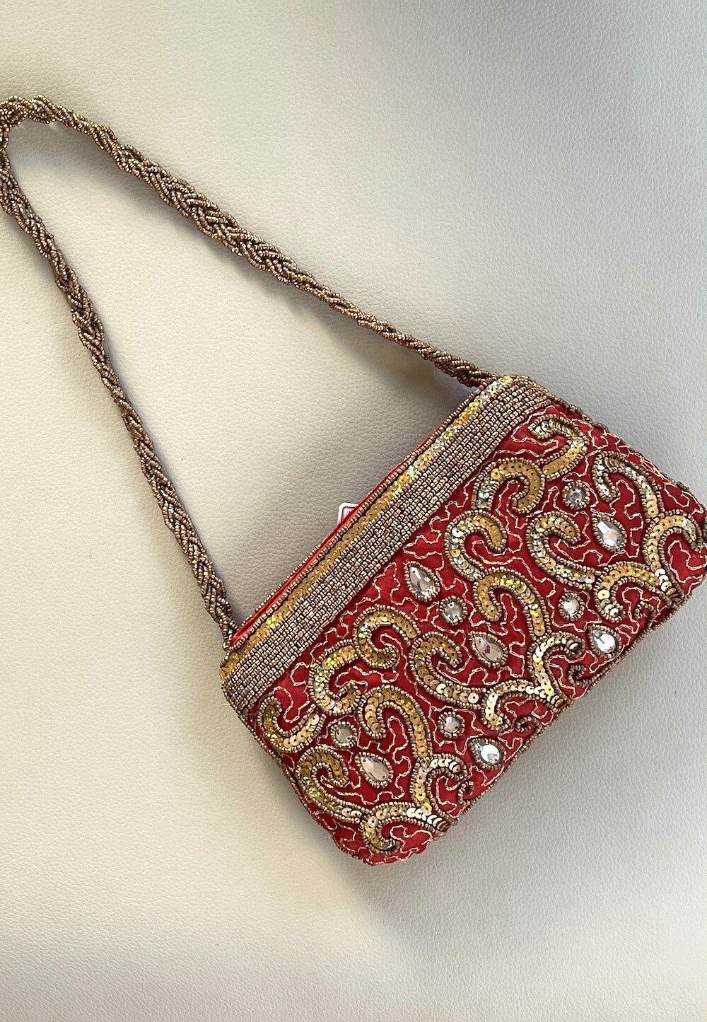 Leuk feestelijk maroon-rood avondtasje met rits uit India, met witte en goudkleurige pailletten en kralen bewerkt