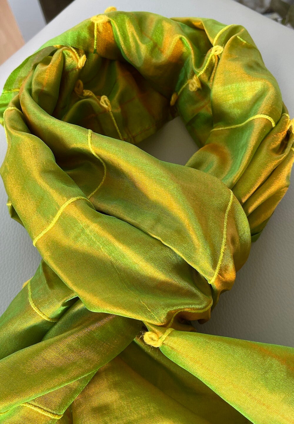 Zijden shawl oranje geel groen met wollen accentstrepen