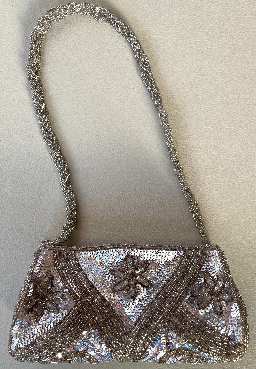 Leuk feestelijk zilverkleurig avondtasje met rits uit India, met goud- en zilverkleurige pailletten en kralen bewerkt, stevig tasje