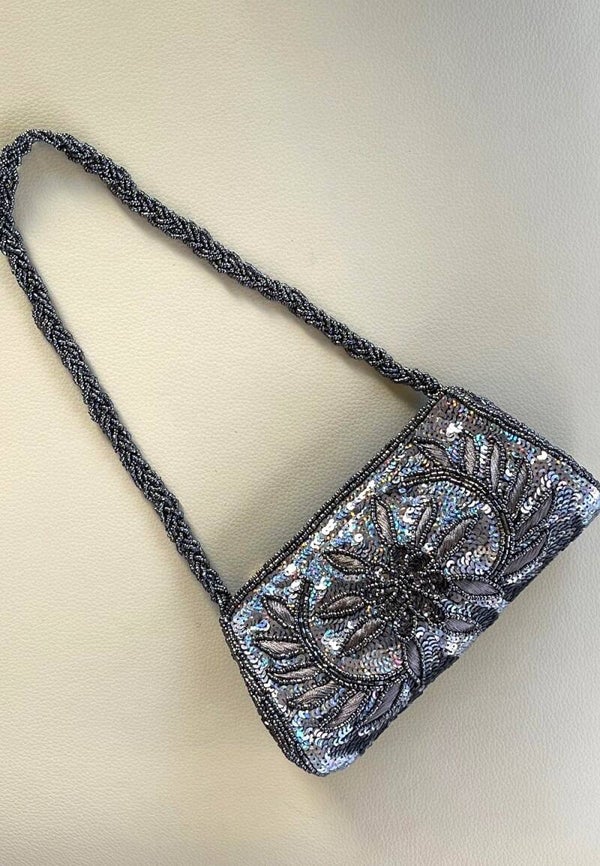Leuk feestelijk grijs avondtasje met rits uit India, met grijze- en zilverkleurige pailletten en kralen bewerkt, stevig tasje