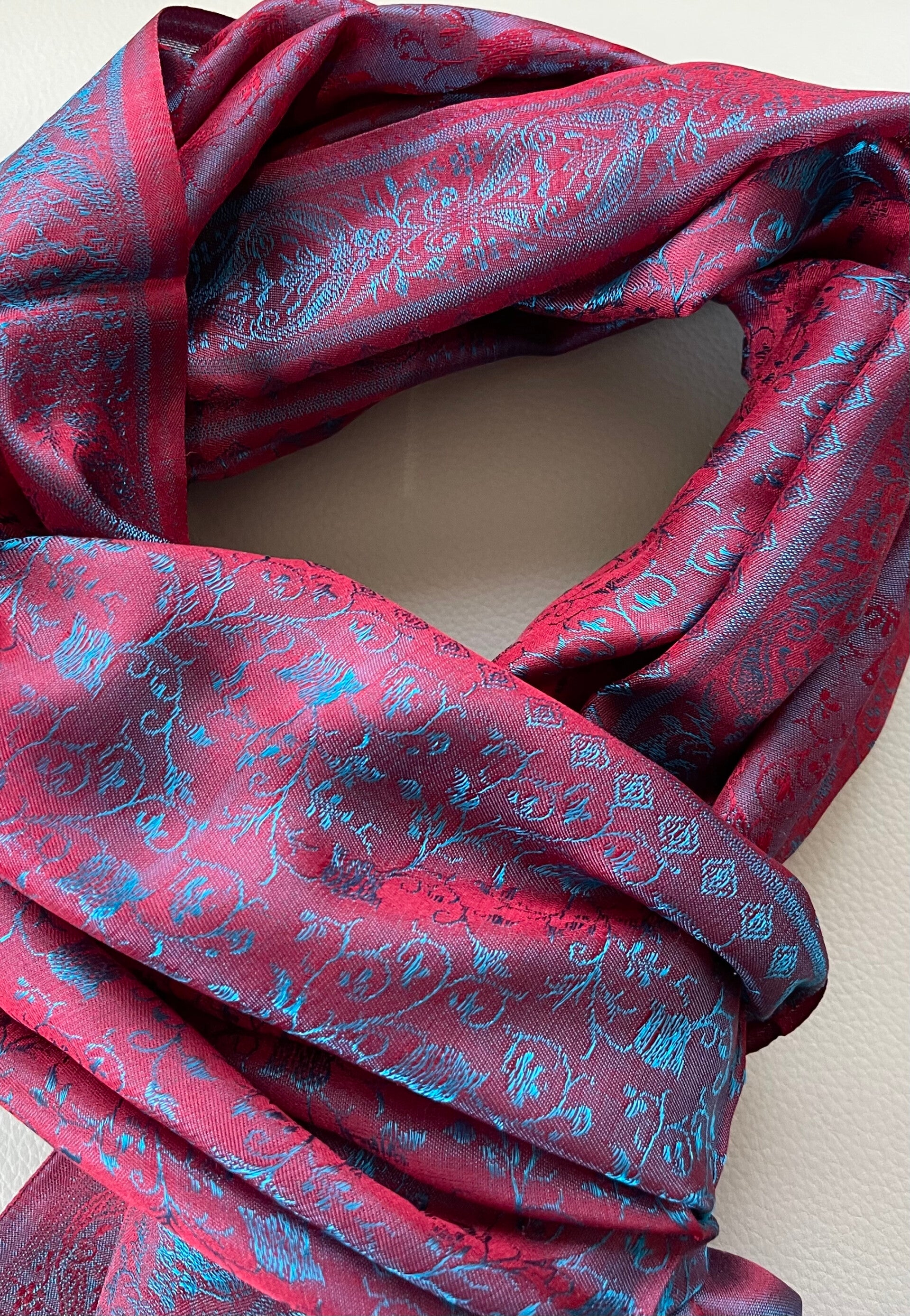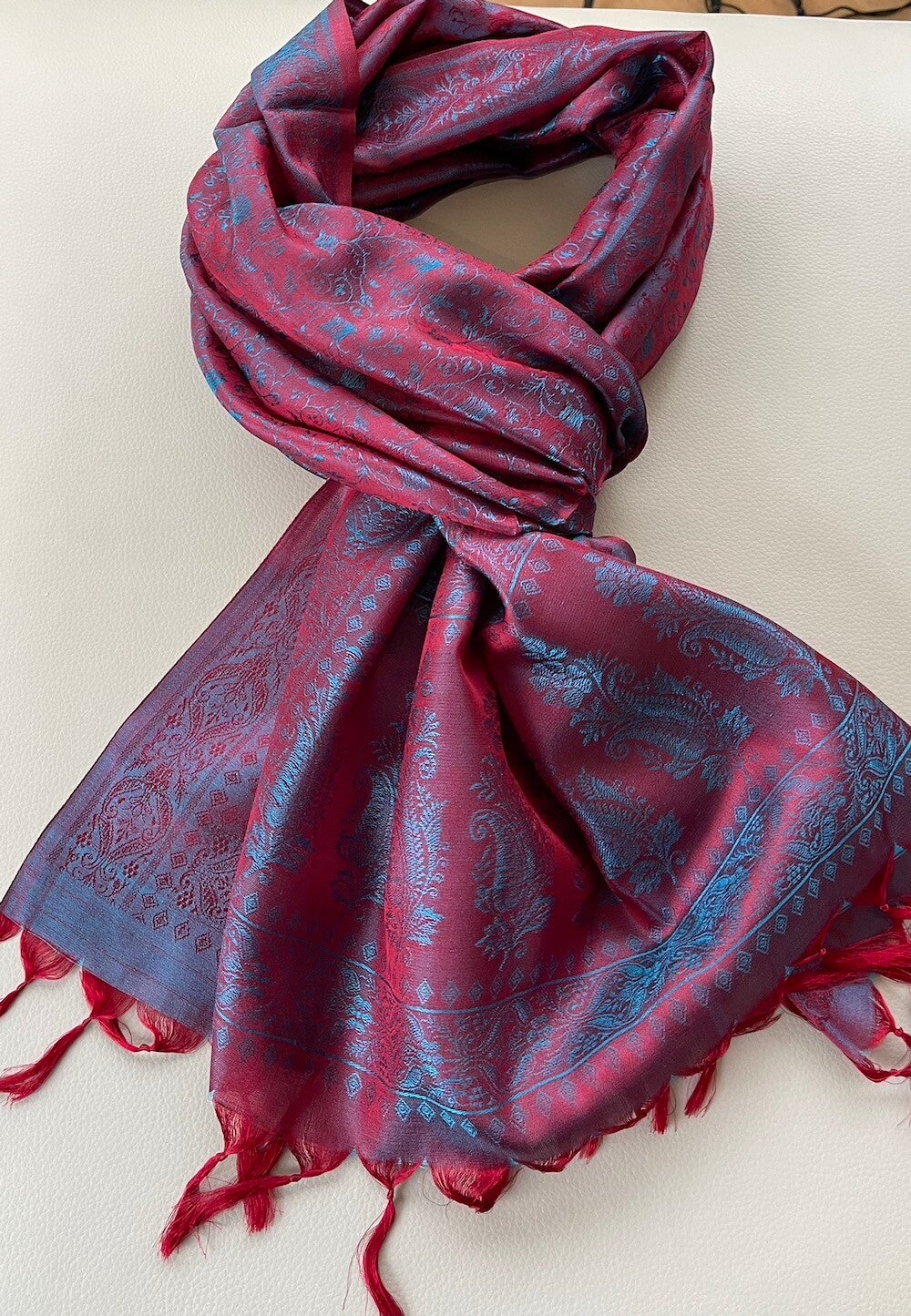 Zachte langwerpige sjaal van zijde in rood en blauw geweven patroon, uit India
