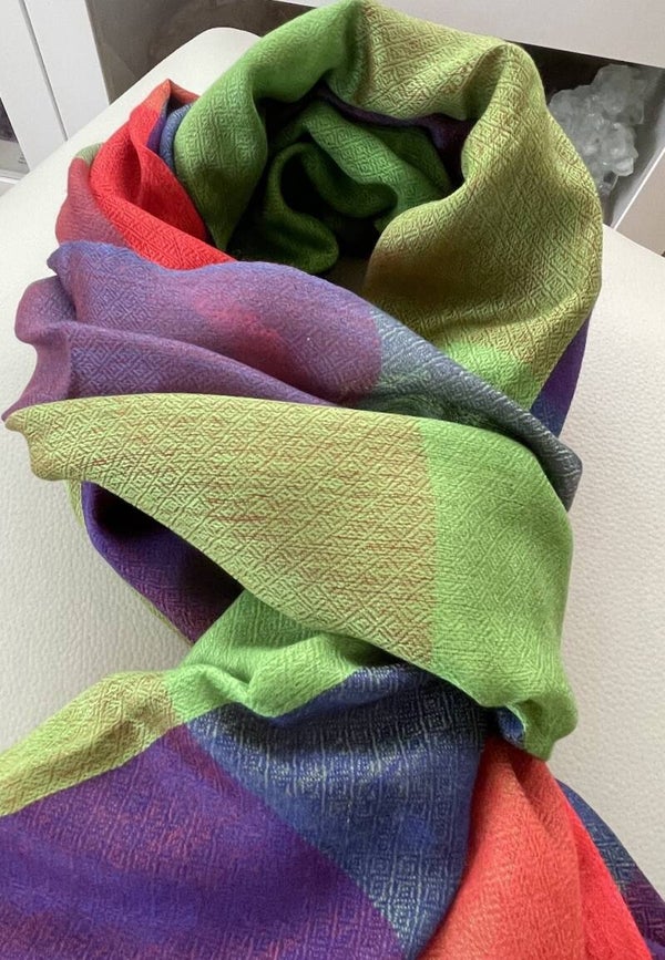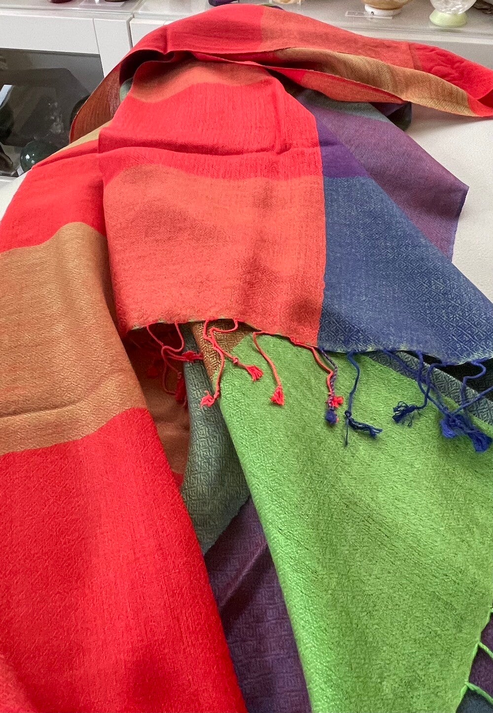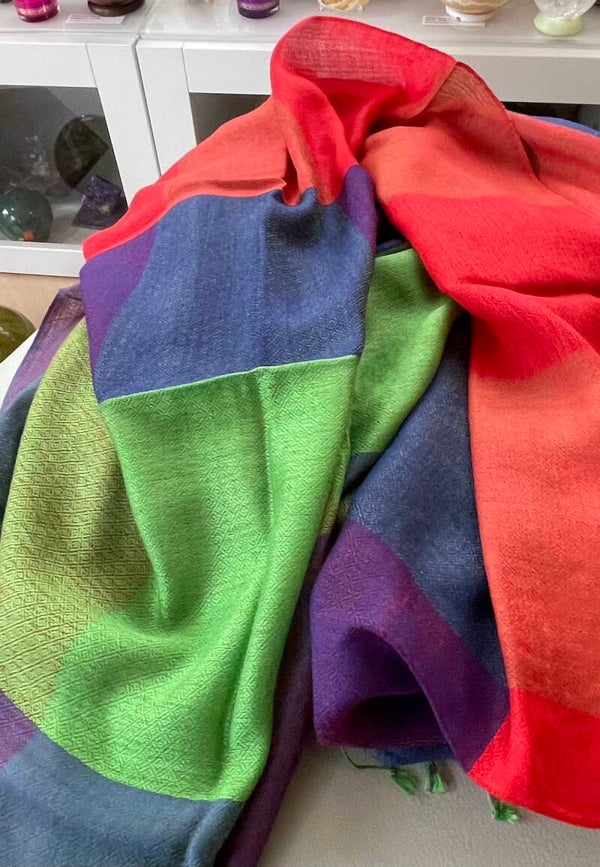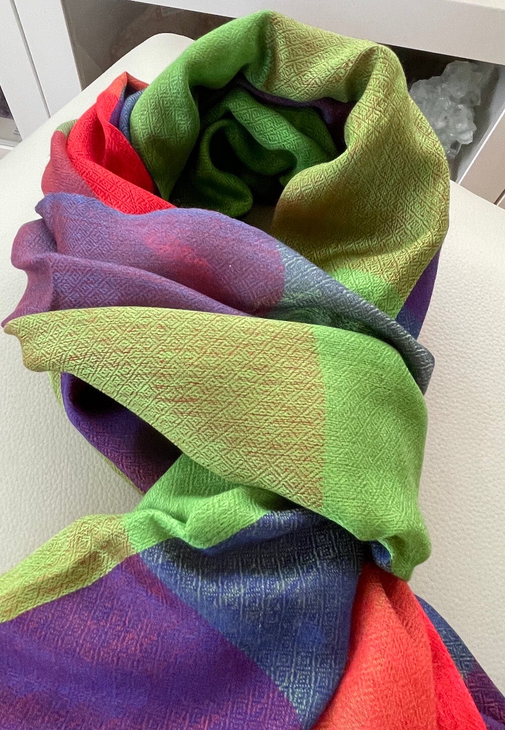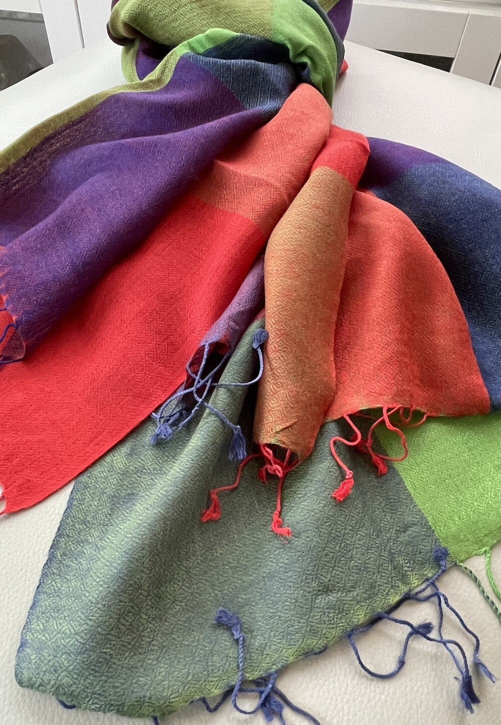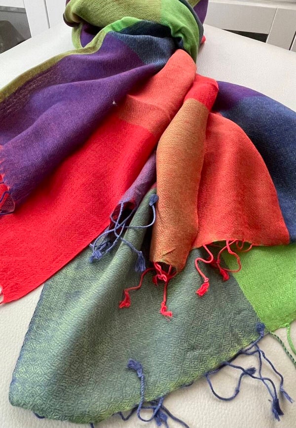 Zijde met wol shawl met blokkenpatroon in groen, blauw, rood, oranje en paars