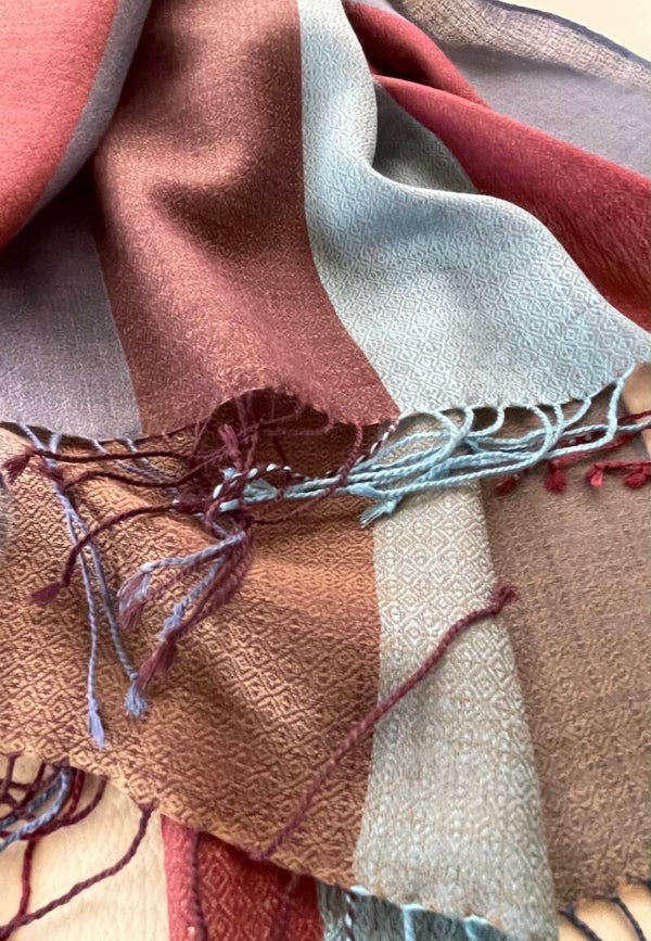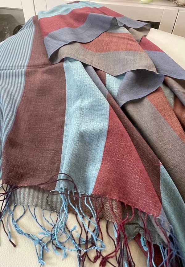 Zijde met wol shawl met streeppatroon in blauw bruin rood