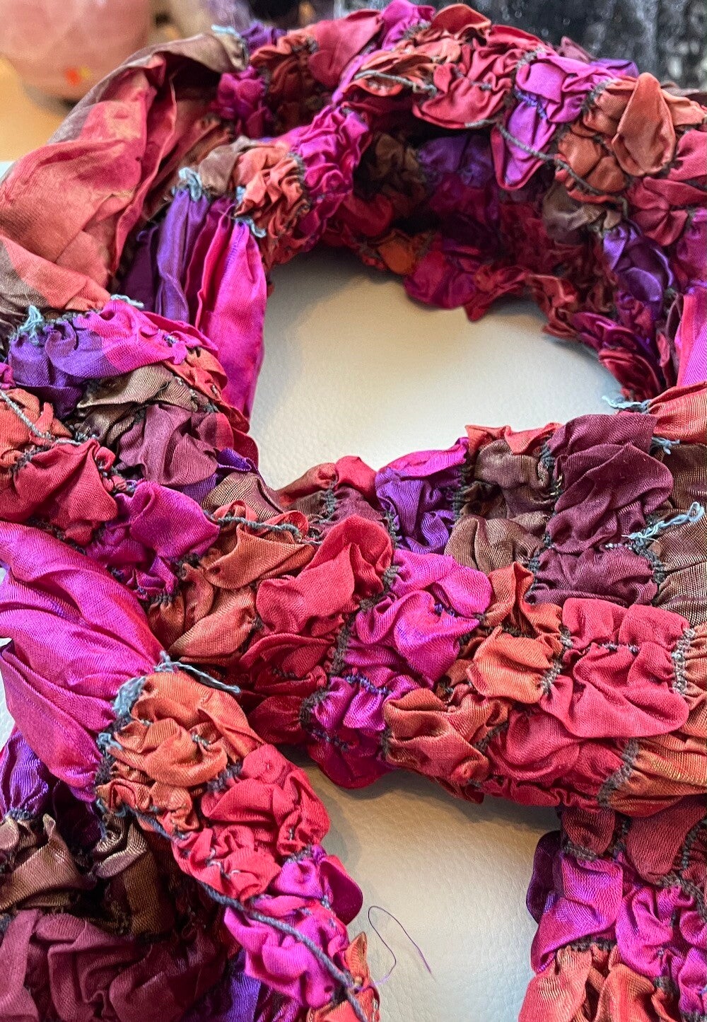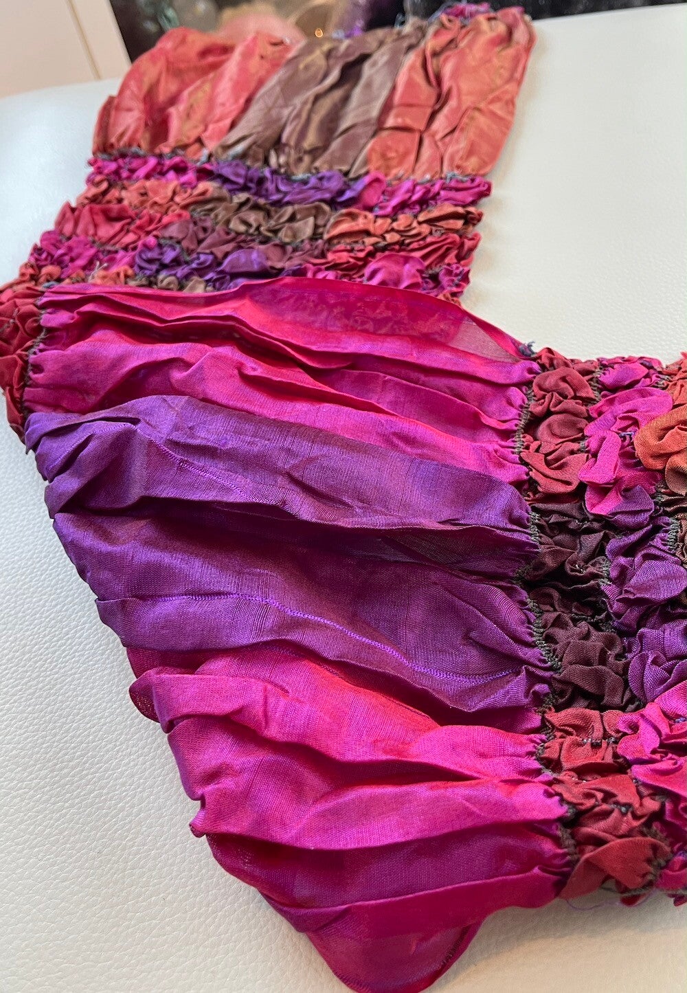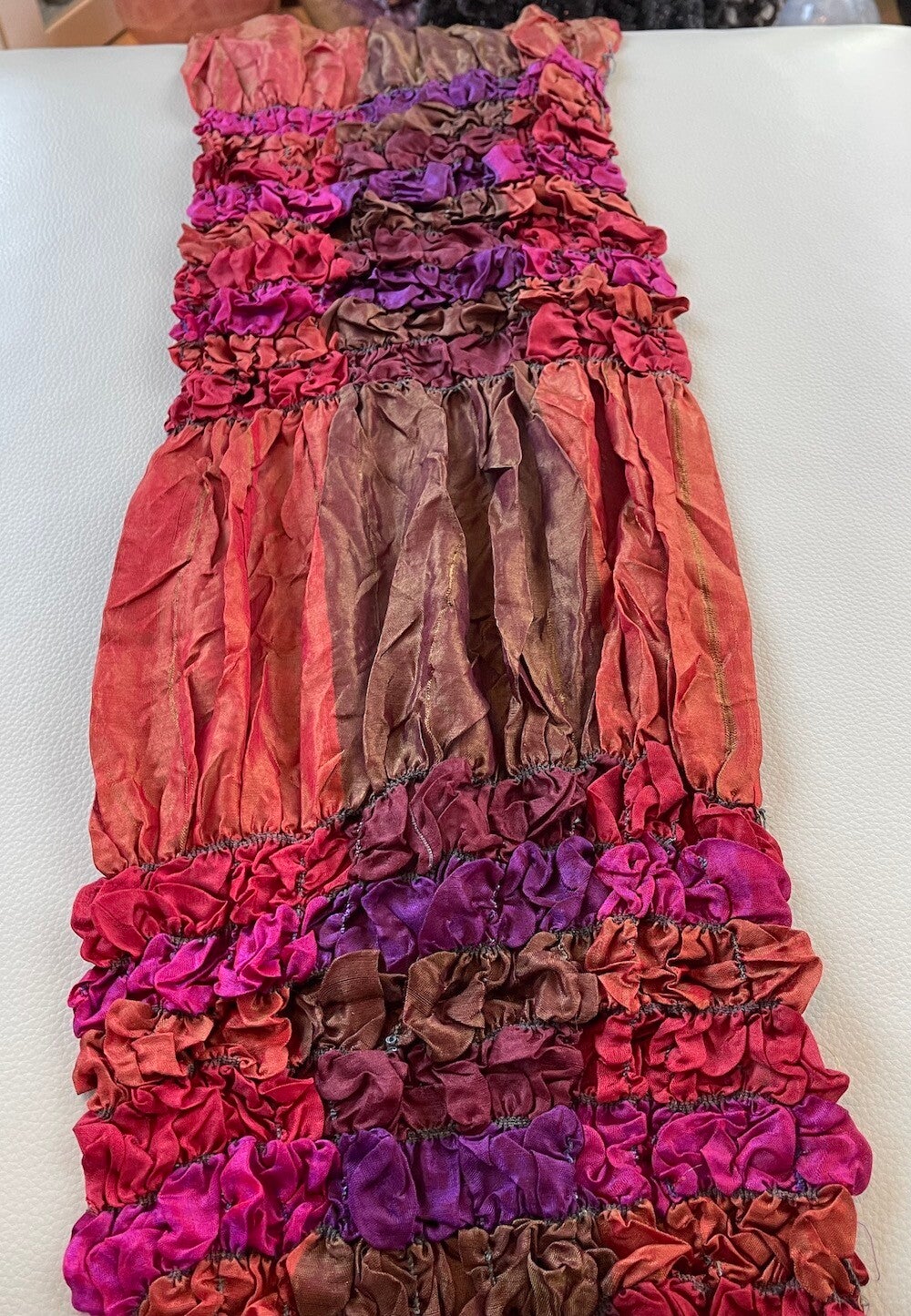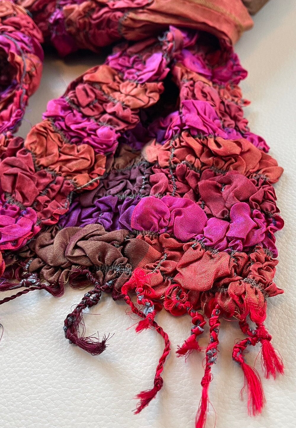 Zijden shawl in rood, fuchsia-roze, oranje, bruin en paars. Deels met crinkle, elastiek en glanzend effect.