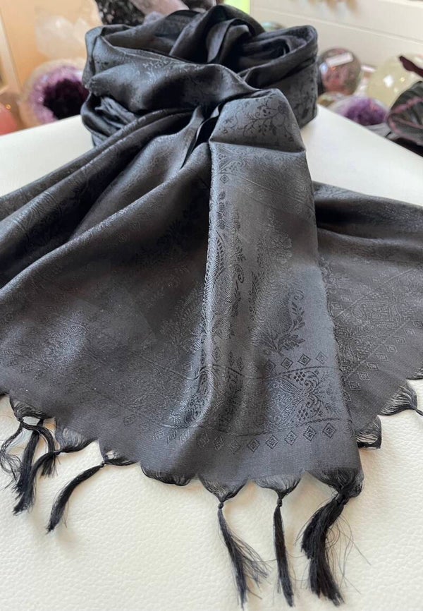 Zachte langwerpige sjaal van zijde met geweven patroon zwart, uit India