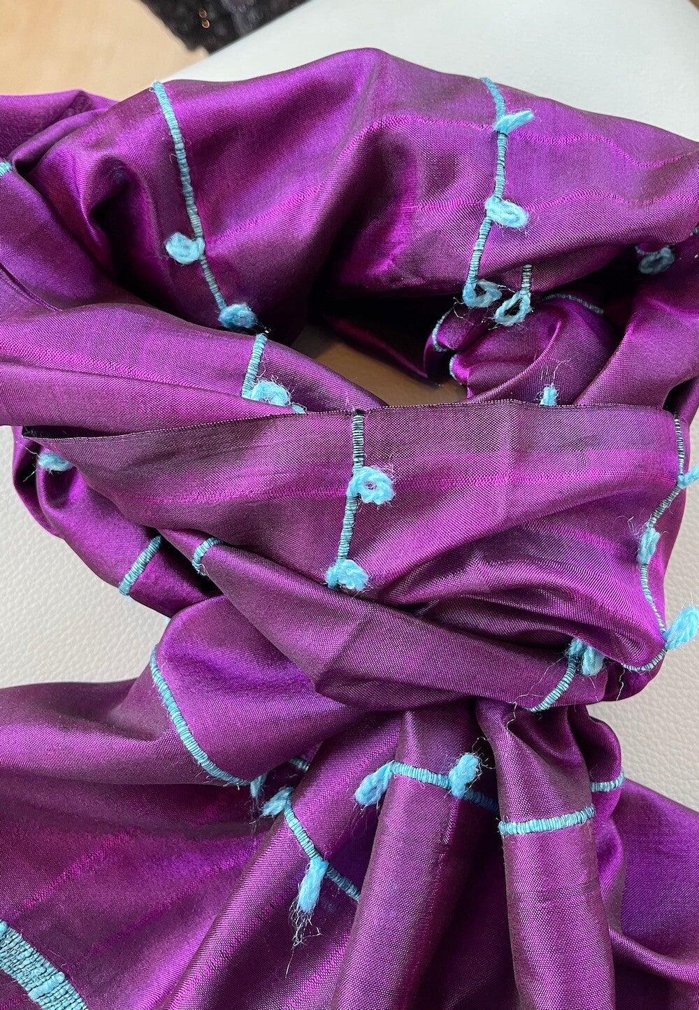 Zachte langwerpige sjaal van zijde in fel paars met lichtblauwe wollen accentstrepen uit India