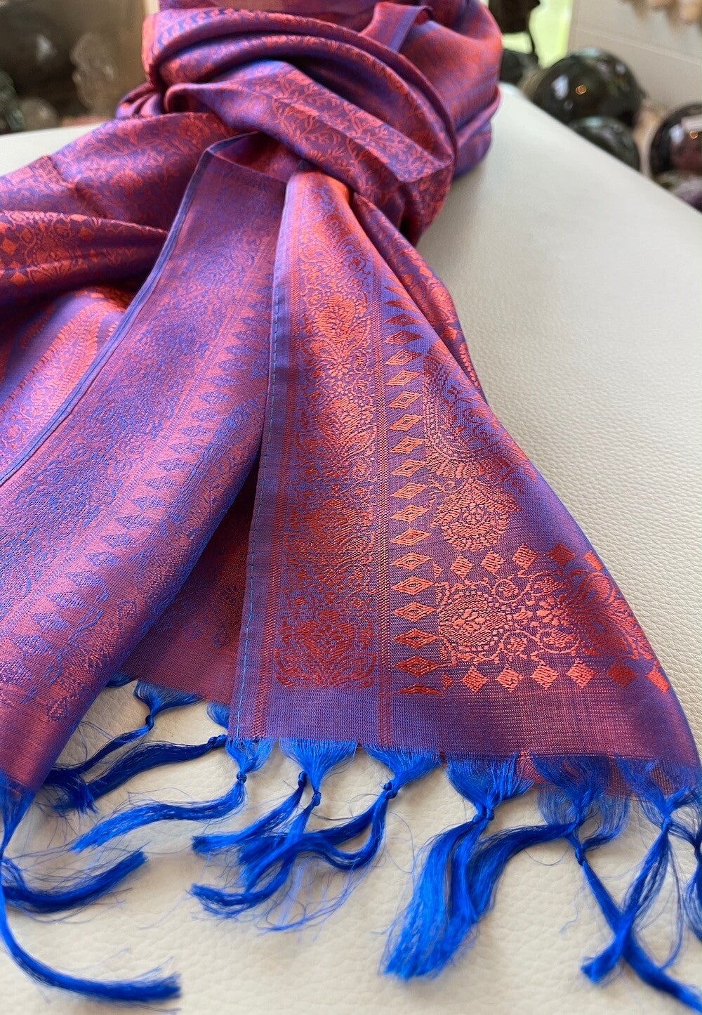 Zijden shawl geweven patroon blauw rood