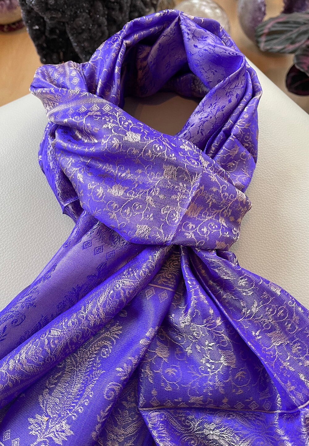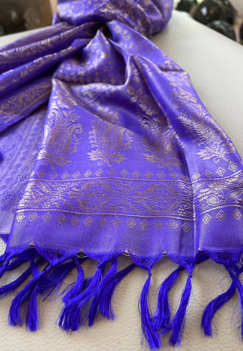 Zijden shawl geweven patroon paars crème