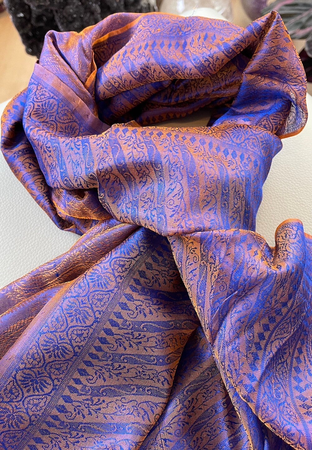 Zijden shawl geweven patroon oranje paars