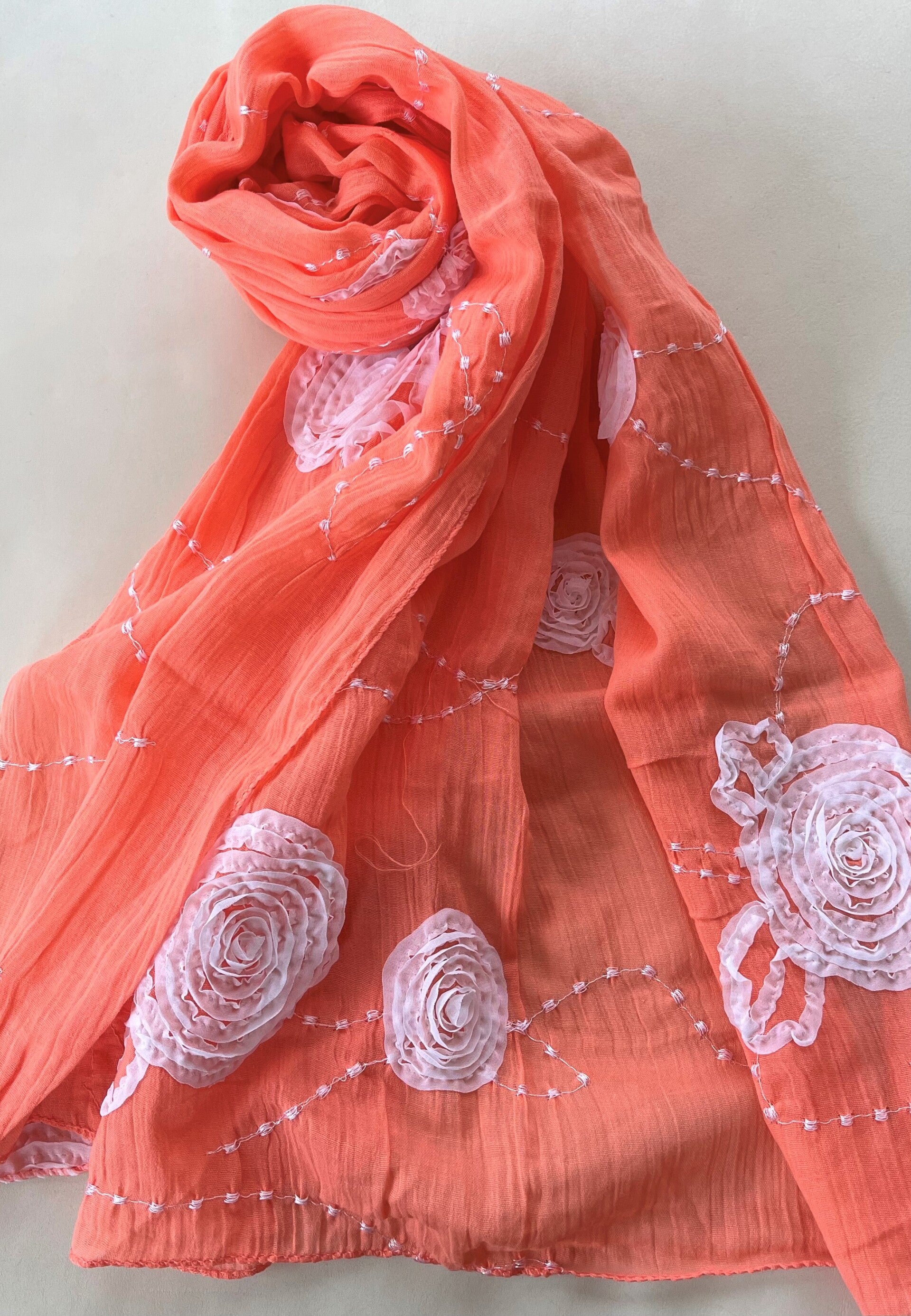 Oranje-roze katoenen sjaal met wit bloemmotief erop gestikt