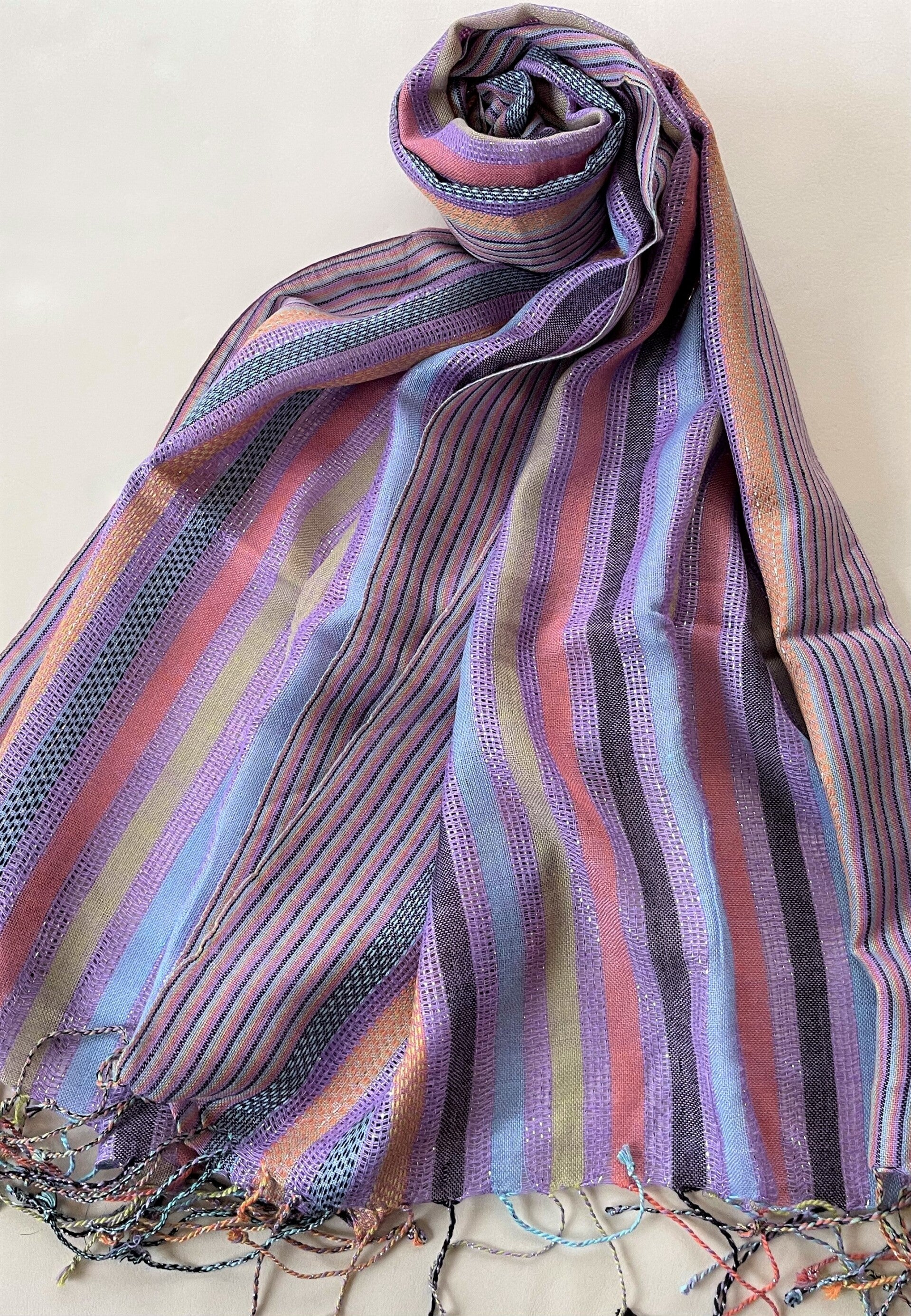 Viscose sjaal met lila kleuren, opengewerkt, strepen en zilverkleurige accenten, uit India