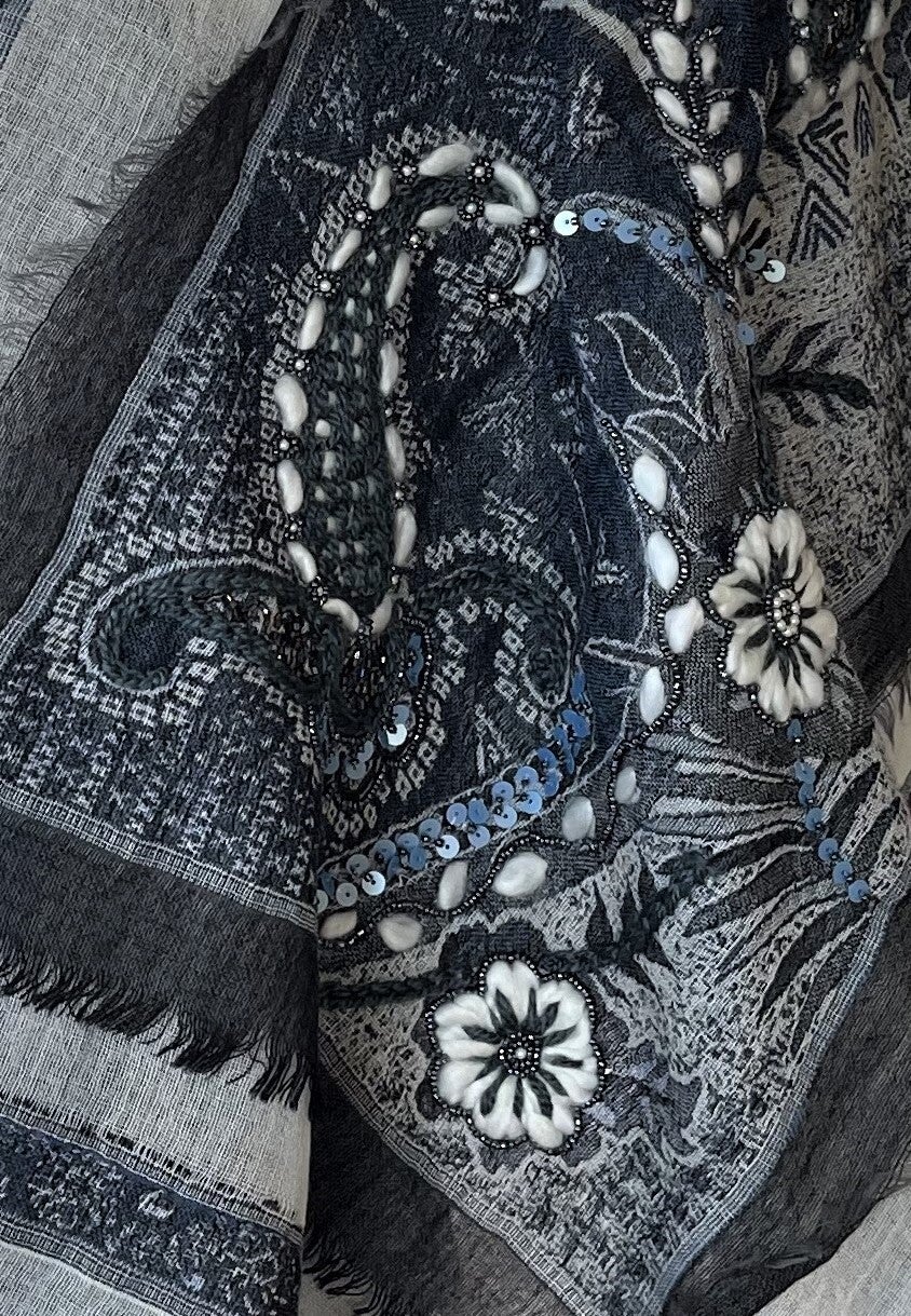 Sjaal van wol met verschillende details en accenten van wol en kraaltjes geborduurd, uit India