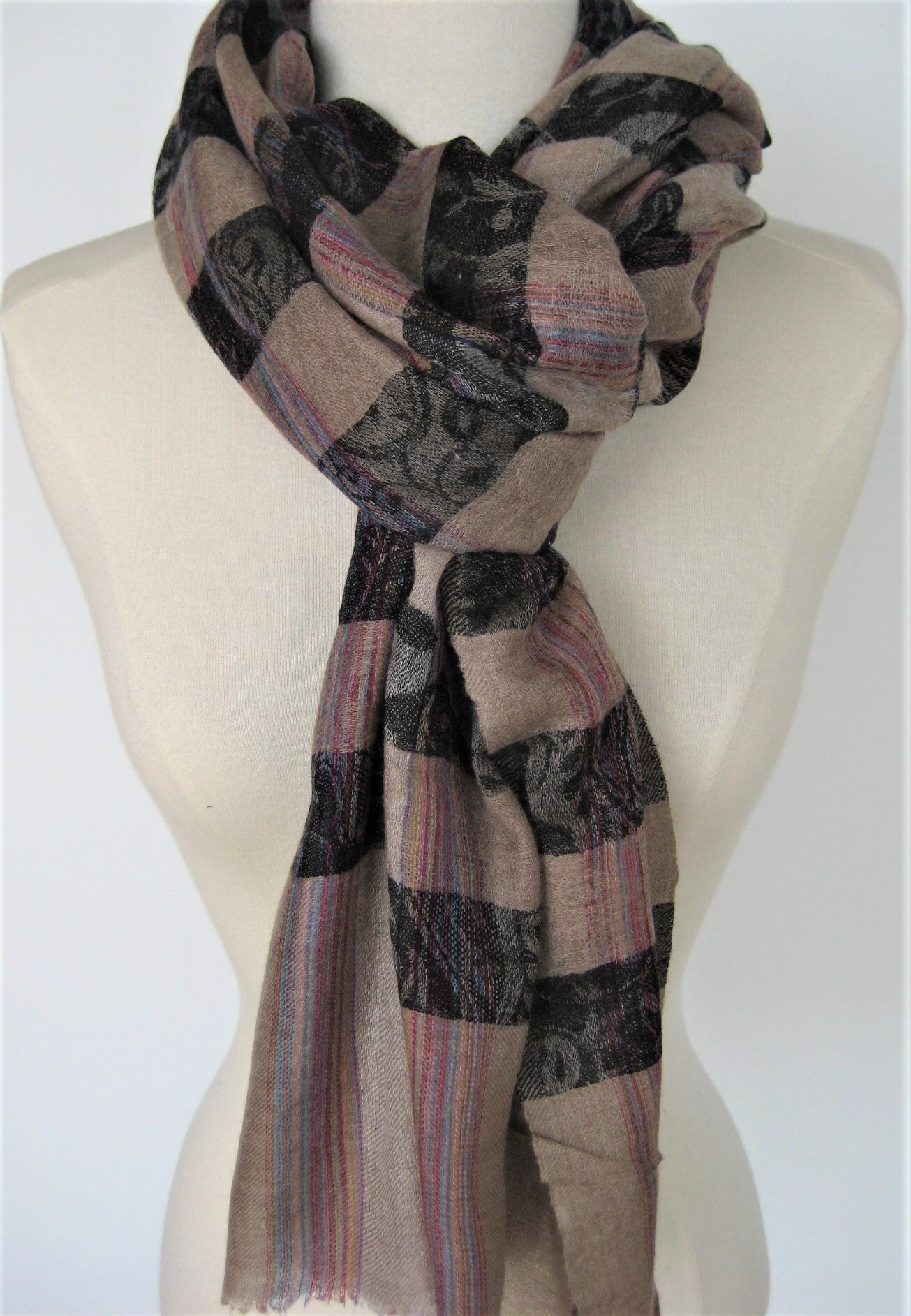 100% Pashmina sjaal in lichtbruin en naturelbruin, zwart en fijne rode en blauwe kleuraccent streepjes, met ingeweven patroon, uit Kashmir, India