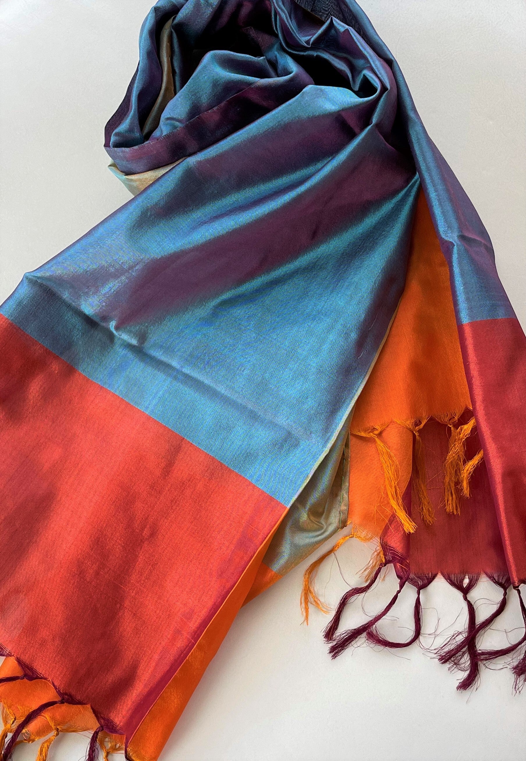 Zijden shawl geweven patroon blauw groen bruin oranje